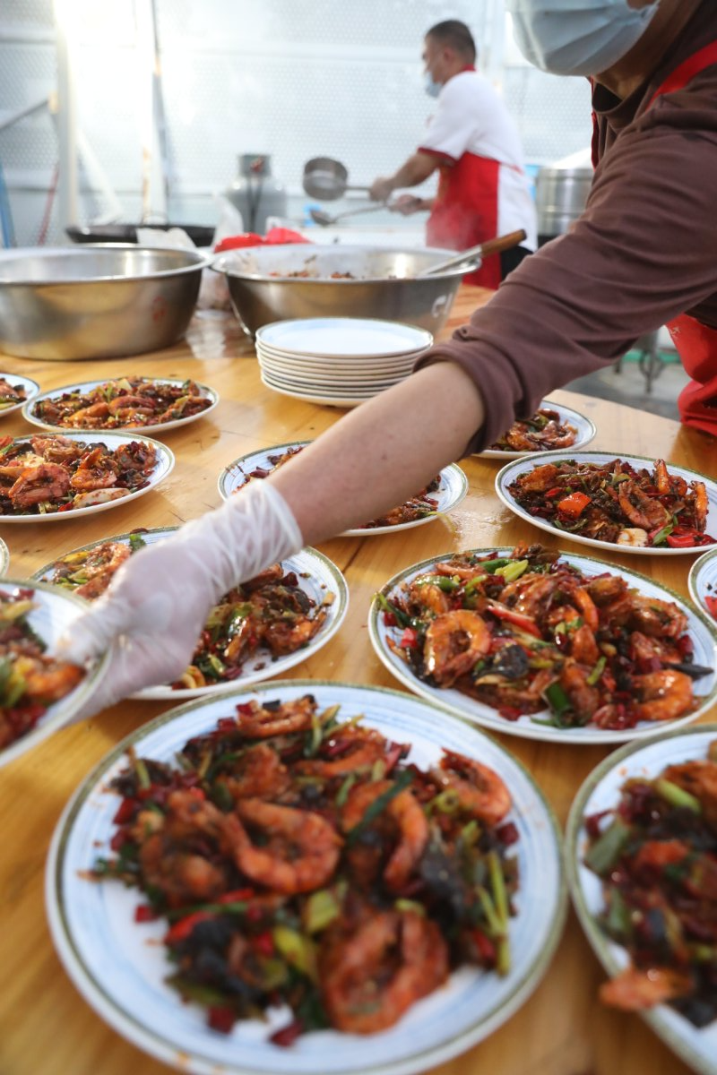 一桌桌丰盛的年夜饭早已准备停当。大盆红烧肉油润发亮,整条清蒸鱼寓意“年年有余”,红艳的油焖大虾、椒香四溢的水煮牛肉……天南地北的菜肴在此汇聚、热气腾腾,乡音乡情和谐共融。