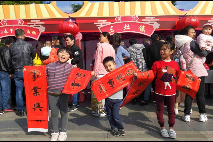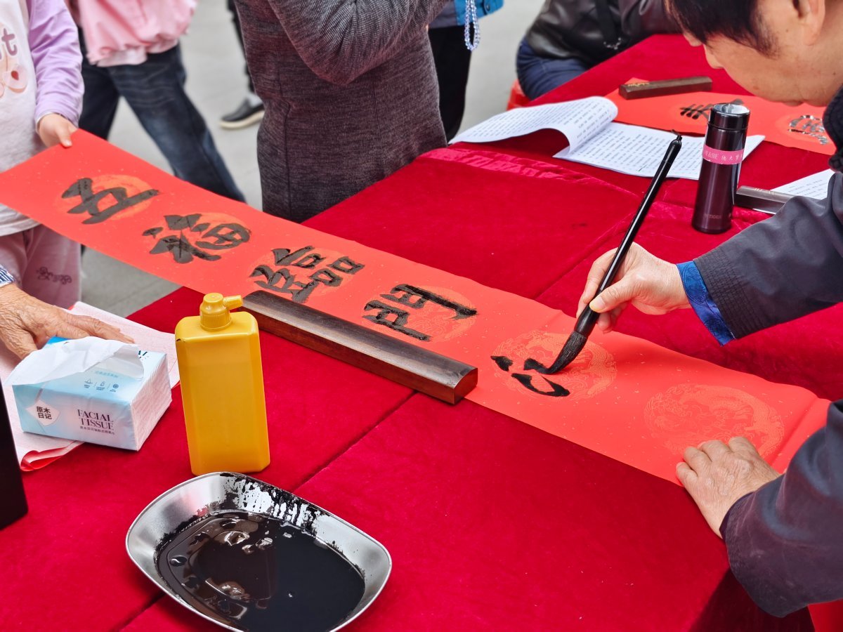 许多家长特意带着孩子前来,感受笔墨间的文化传承。孩子们围在案前专注观摩,书画家们耐心指导握笔运笔,讲解春联的由来与讲究,让活动成为一堂生动的传统文化体验课。居民还可根据自家喜好定制个性化春联,书画家皆欣然应允,以笔墨满足多样需求。现场,老人手持春联连连称赞“真有年味”,年轻人则用手机记录温馨瞬间,分享给远方亲友。