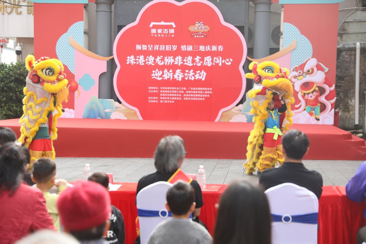 “咚咚锵,咚咚锵……”2月5日,珠海高新区唐家古镇时光广场上,一场以“狮舞呈祥辞旧岁,情融三地庆新春——珠港澳龙狮非遗志愿同心迎新春”为主题的活动在此举行,珠港澳三地的龙狮队伍、非遗传承人和志愿者代表齐聚一堂,共同奏响了新春的欢乐乐章。