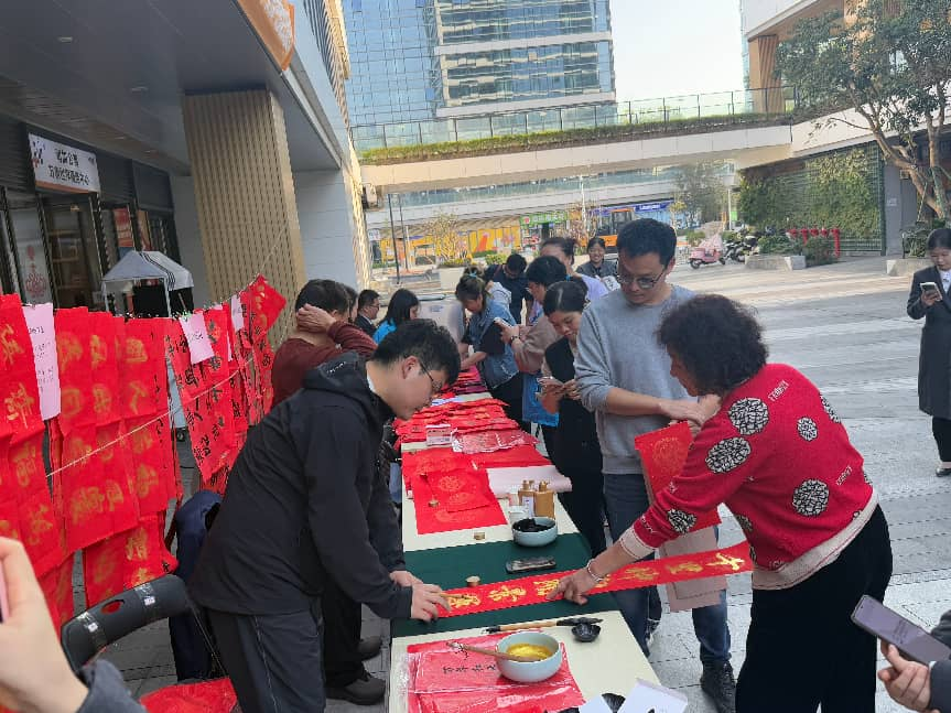 活动现场墨香四溢、红纸铺展。居民可挑选老师预先书写的百余副对联和“福”字免费领取,也能定制内容让老师现场创作。笔墨勾勒新年憧憬、饱含幸福祝愿,不少居民手捧春联,笑容满足。此外,现场设新春知识问答,涵盖传统文化、节日习俗等内容,答对可得惊喜盲盒积木。活动以笔墨为桥,串联社区温暖与文化传承。