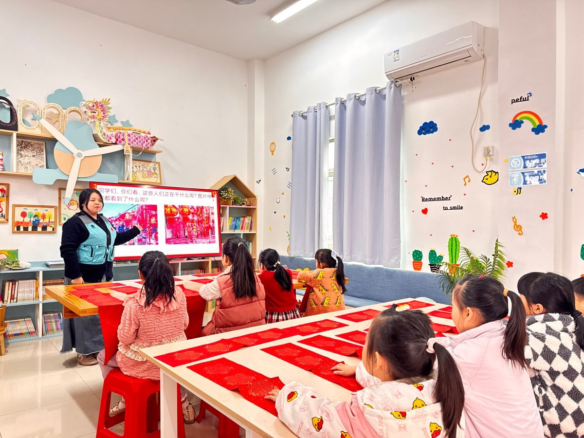“为什么春联要用红色纸张?”“上联和下联怎么区分?”科普环节后进入互动问答与技能教学阶段。孩子们踊跃举手提问,社工逐一进行解答。