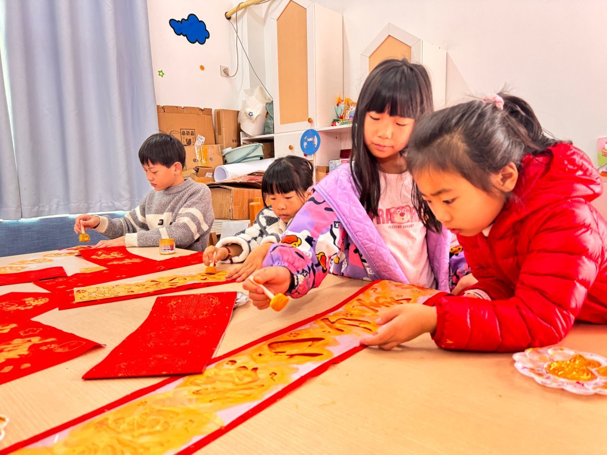 活动现场暖意融融,大红对联纸、拓印模板、环保油墨、拓印工具整齐摆放,浓郁的年味儿扑面而来。社工化身“文化讲解员”,通过生动有趣的科普环节拉开序幕,以“什么是春联”为切入点,系统讲解春联的起源、发展历程以及“对仗工整、平仄协调”的基本创作规则,重点介绍“福”字倒贴的民俗寓意和大门、房门春联的张贴礼仪,让孩子们直观感受传统书法艺术与年节文化的深厚底蕴。