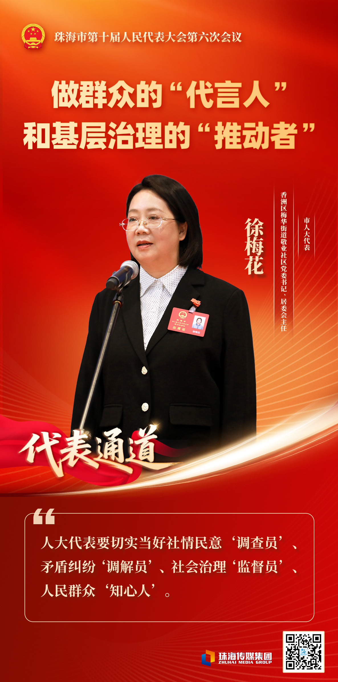 基层治理是国家治理的基石。作为基层人大代表,香洲区梅华街道敬业社区党委书记、居委会主任徐梅花充分依托社区居委会这座“连心桥”,在家长里短和走街串巷中倾听民声、收集民意,聚焦消防安全、交通安全、老旧小区改造、停车难等老百姓关切的领域,积极建言献策,推动问题解决在基层、化解在萌芽状态。