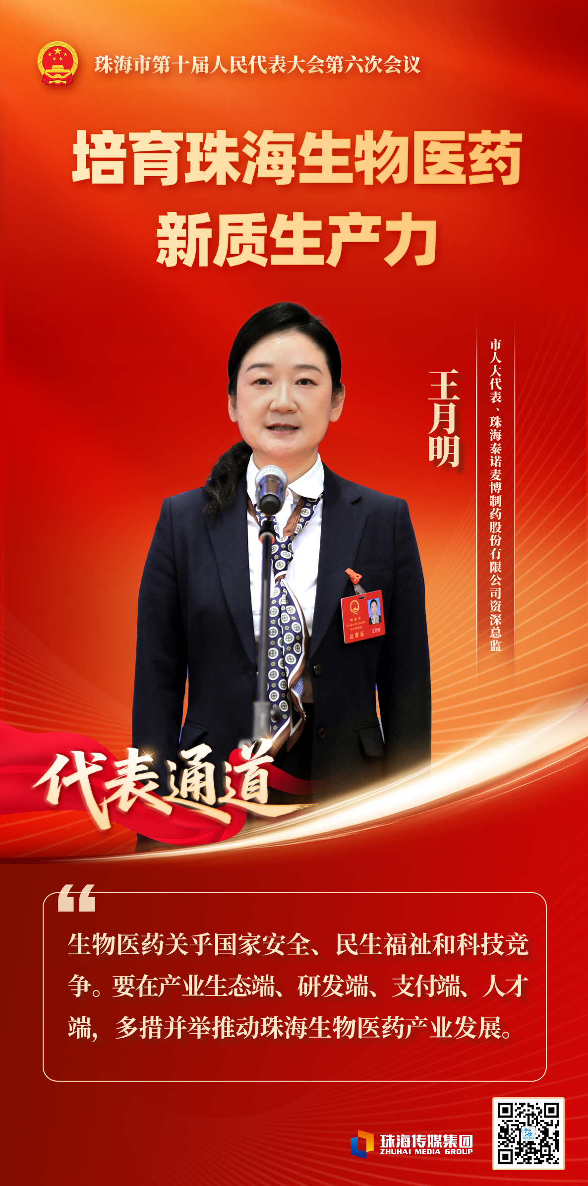 市人大代表、珠海泰诺麦博制药股份有限公司资深总监王月明深耕创新药研发领域多年,对推动珠海生物医药产业发展提出了四个发力方向: