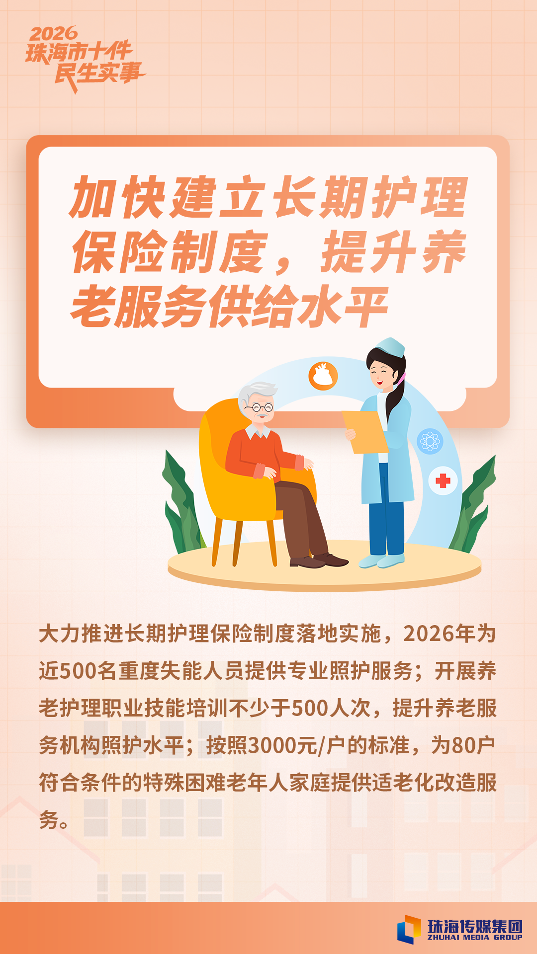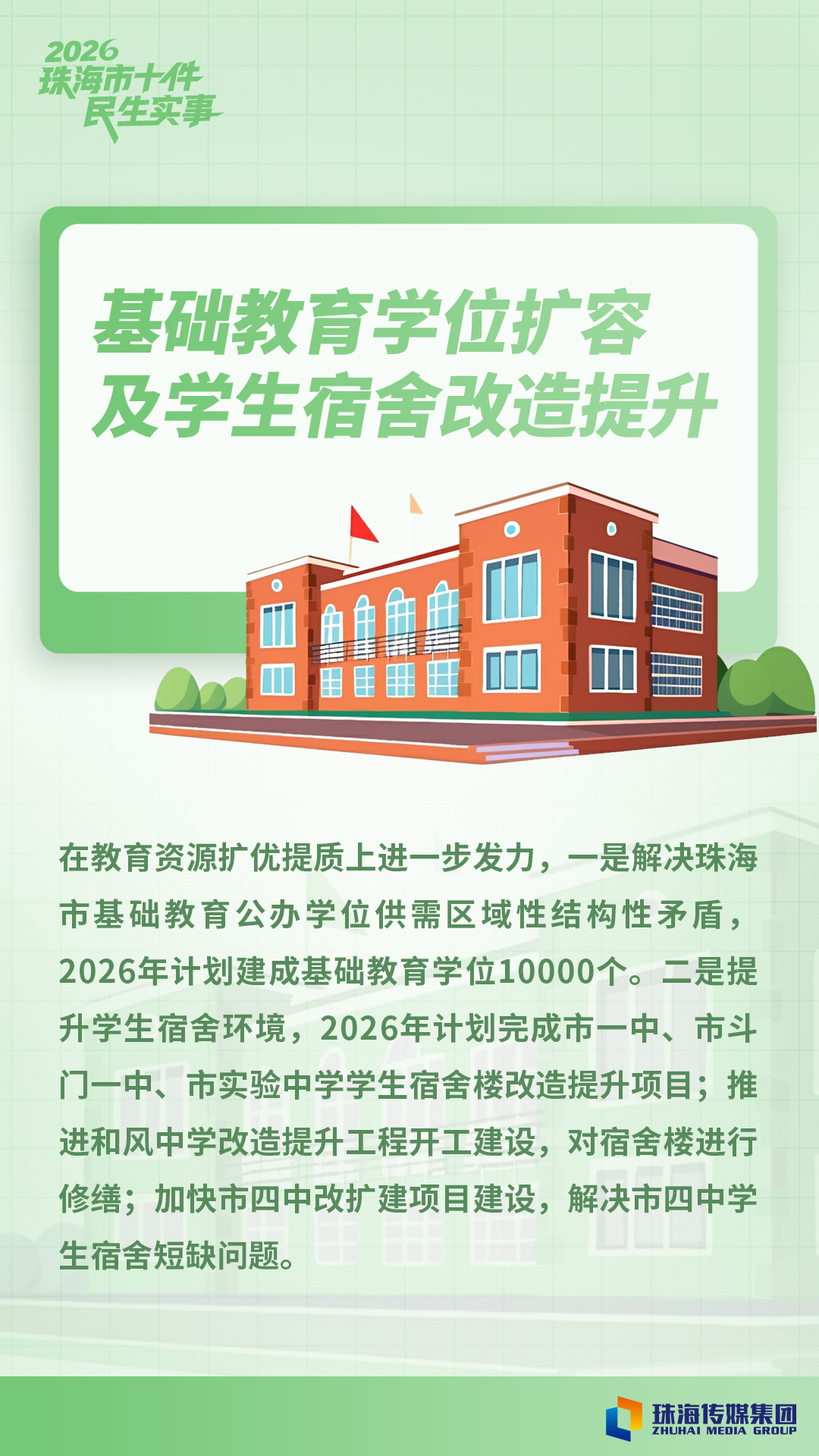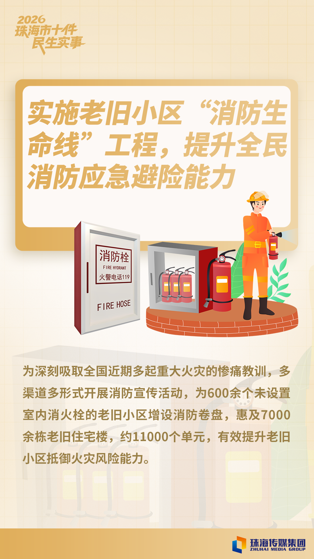 2026年度十件民生实事包括:实施老旧小区“消防生命线”工程,提升全民消防应急避险能力;加快建立长期护理保险制度,提升养老服务供给水平;青少年心理健康促进行动;保障性住房供给优化和老旧小区改造提升;落实育儿支持保障,推进生育友好型社会建设;“餐桌安心、用药放心”,守护民生安全专项行动;基础教育学位扩容及学生宿舍改造提升;完善西部地区水利防潮洪工程体系;建设一批城镇污水收集、处理设施,巩固提升乡村污水治理效能;城市交通畅通安全与智能化提升工程。