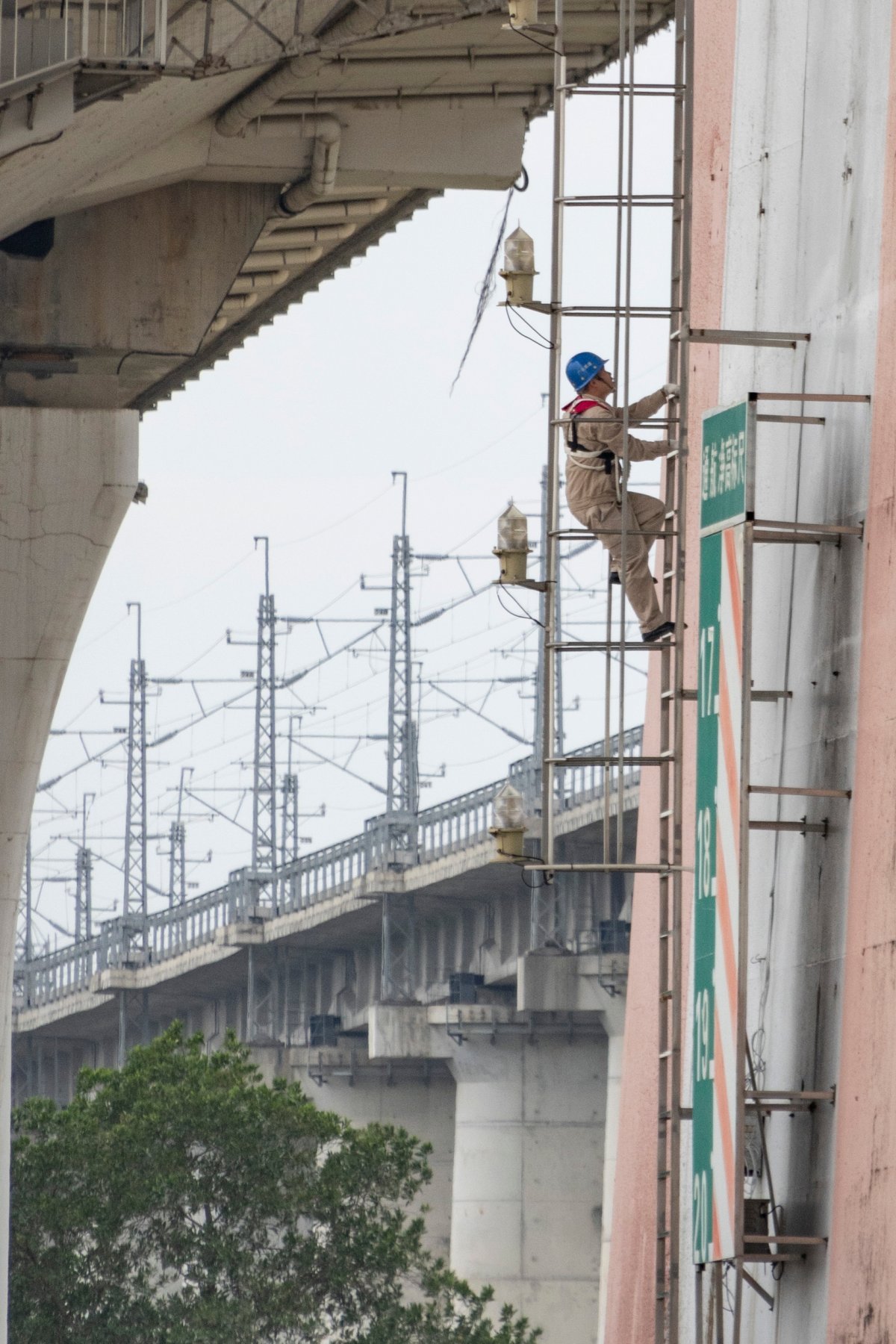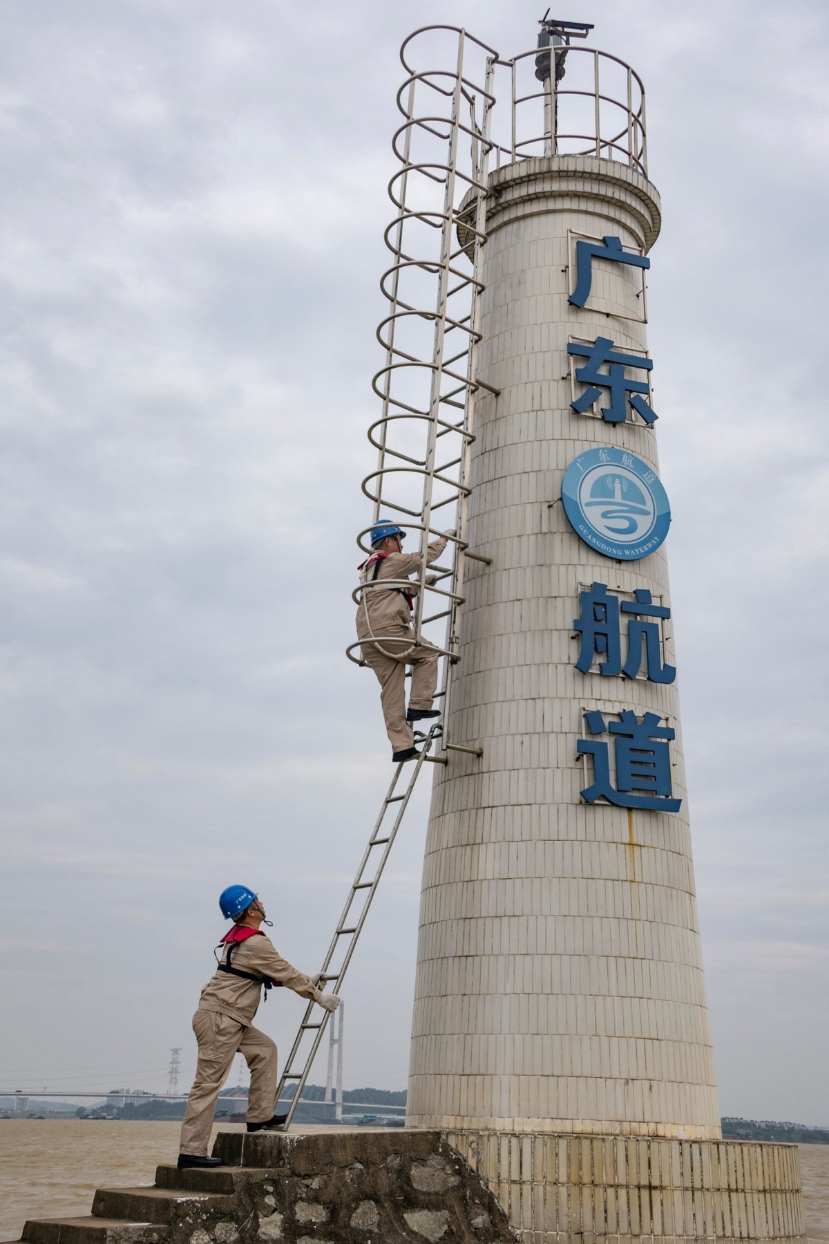 在桥区航道,航道中心职工顺着铁架爬上数十米的高空,对桥涵标进行调试检查。