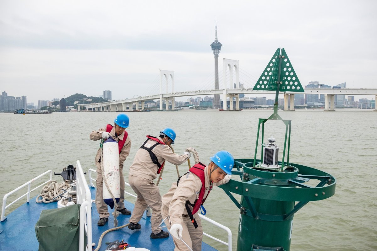 在粤澳区界航道,航道中心职工顶着风浪登上浮标,细心地进行清洁和保养作业。