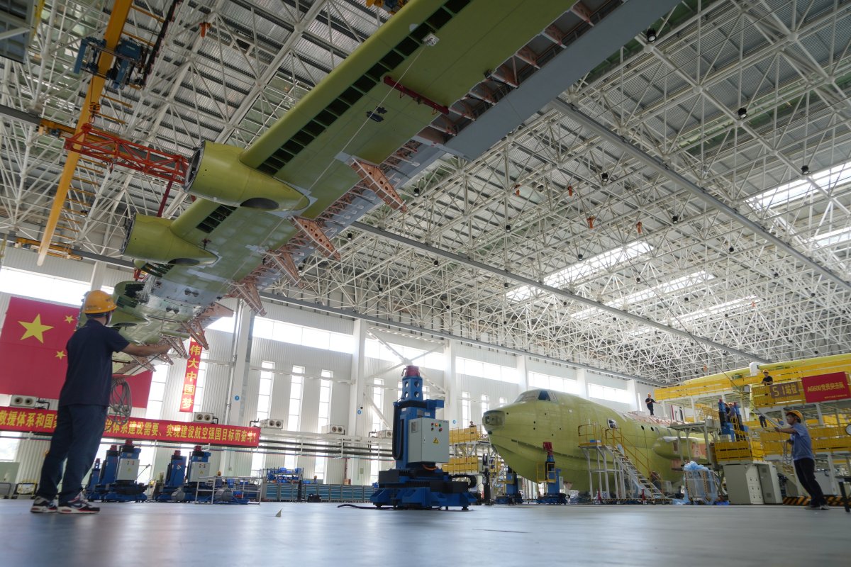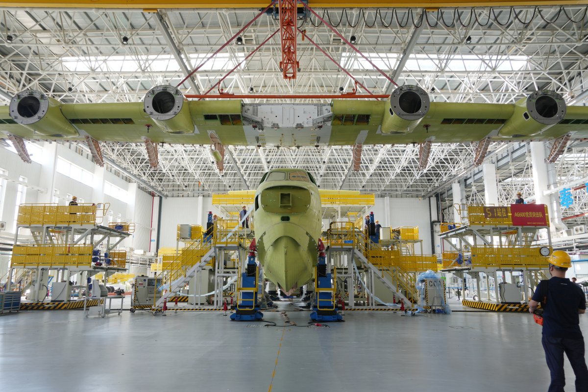 巨大的飞机总装厂房里,在“百日攻坚促生产,万众一心铸重器”的大红横幅下,第四架批生产型号的AG600“鲲龙”已经初具雏形,黄绿色的机身足有三层楼高,四台涡桨发动机全部安装到位,魁梧有力的身姿极具视觉冲击力。