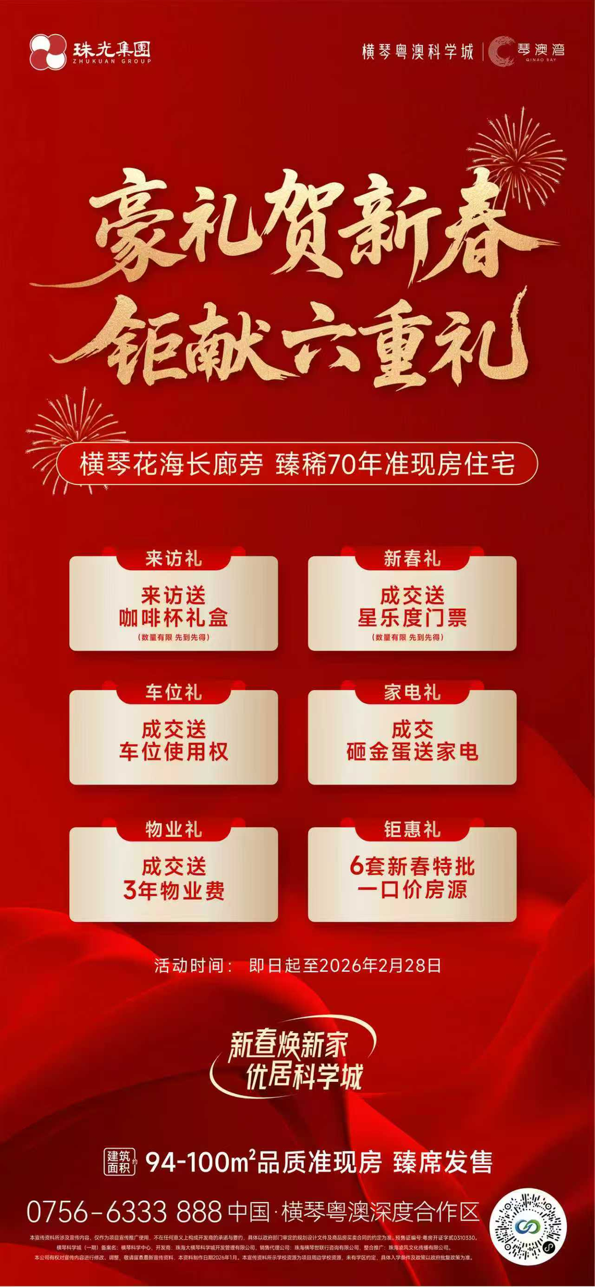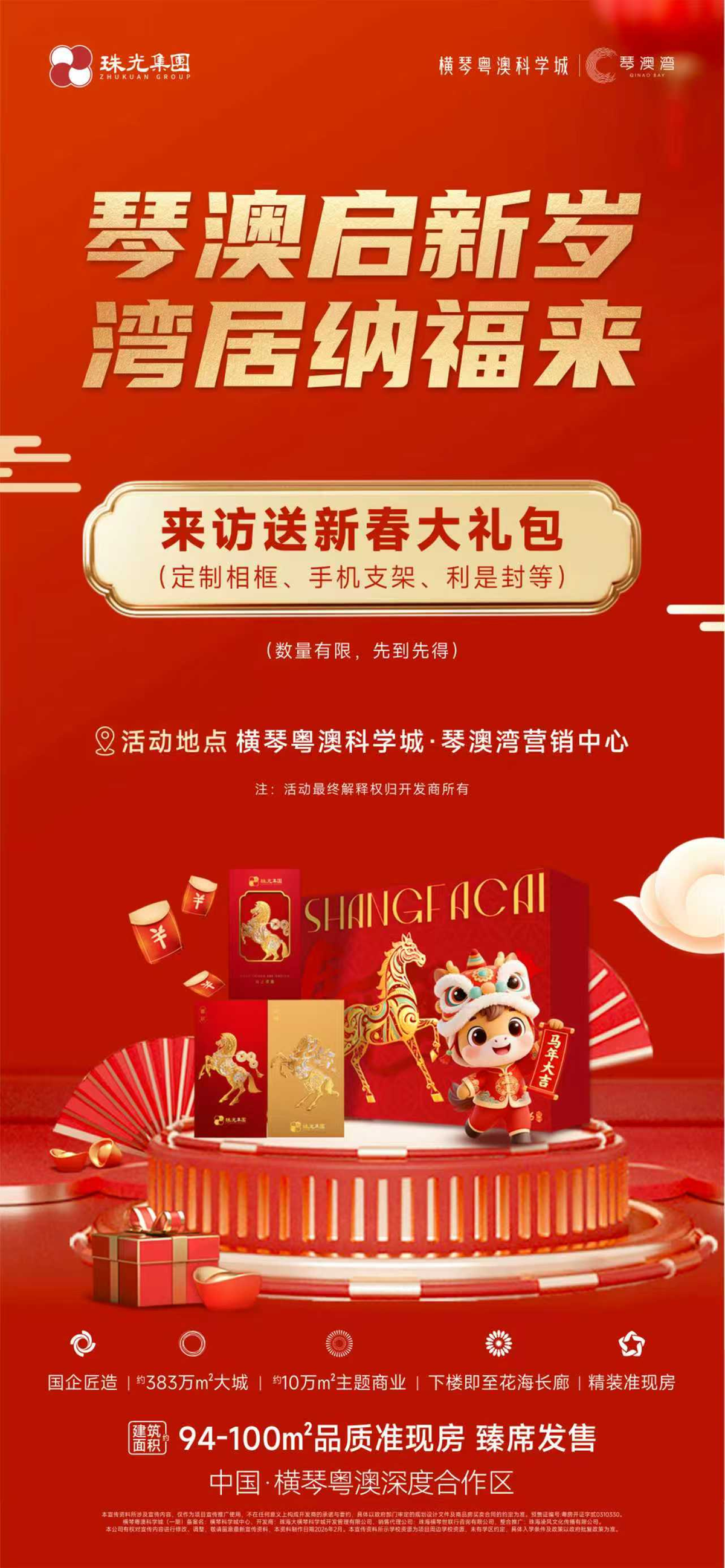 横琴科学城同步发力新春置业市场,推出包含成交奖、来访奖、成交送品牌家电等在内的新春置业6重厚礼,来访即送定制新春礼包,更专属推出新春特批一口价房源,依托横琴粤澳深度合作区核心区位与稀缺纯住宅优势,实打实回馈置业者。