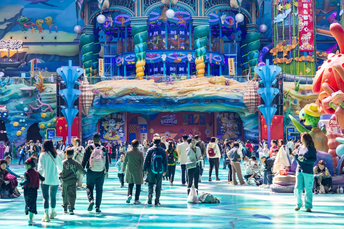 在长隆海洋度假区,亲子家庭成为主力军。冰山过山车、雨林降落塔等热门项目平均排队30至45分钟,游客热情高涨。园区重磅推出的“鲲鹏巡游大秀”成为最大亮点,据介绍,这是长隆历时两个月打造的巨型空飘,采用特质TPU环保材质和分段式气囊结构,轻盈灵动,流光溢彩,引得游客阵阵惊叹。荷兰、意大利街头戏剧大师献艺中国年,与粉丝亲切互动,中西文化在此交融碰撞。