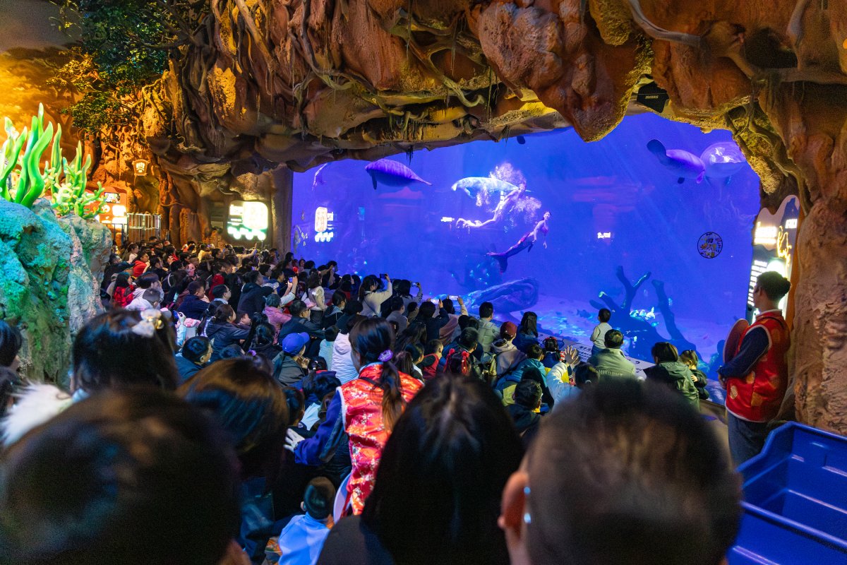 不远处的飞船乐园内,水下变脸、水下财神、美人鱼贺岁等创新表演同样吸睛。“传统年俗和现代表演技术结合,孩子看得津津有味,这里的年味更浓了!”游客林女士点赞。