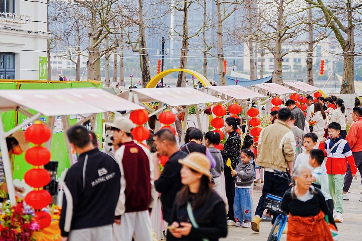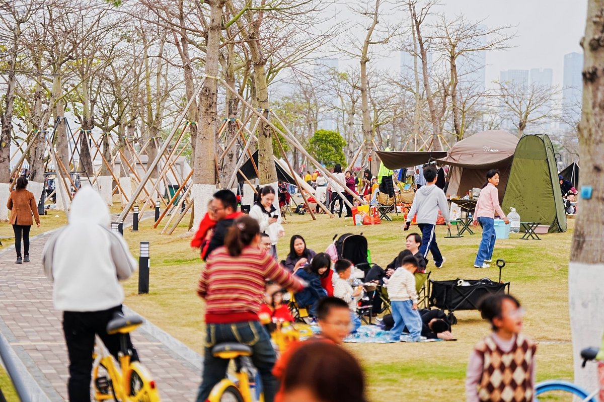 不远处,缤纷的花海与人潮相映成趣,家庭野餐、风筝飞舞、绿道骑行的场景随处可见,欢声笑语与自然气息和谐相融。