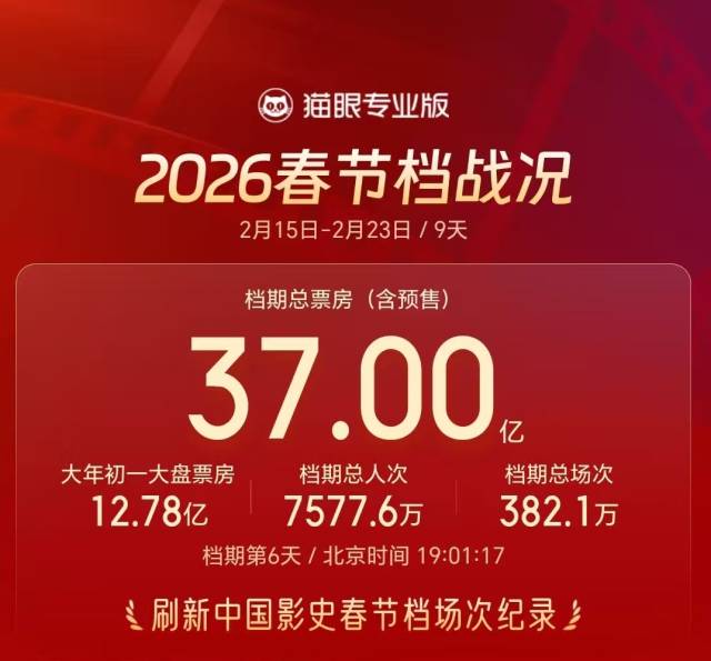 据猫眼专业版数据,截至2月20日19时30分,2026年春节档(2月15日—2月23日)总票房(含预售)已突破37亿元,总观影人次超7577万,总放映场次达382.1万,刷新中国影史春节档场次纪录。广东省春节档票房突破3.4亿元,总放映场次超40万,总观影人次超740万。