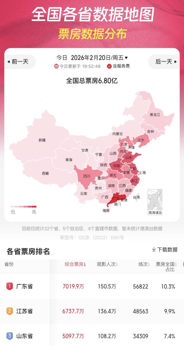 值得一提的是,广东在大年初四(2月20日)单日票房突破7000万元,超越江苏省,重回全国票房第一。业内人士分析,这得益于粤语喜剧电影《夜王》上映以及广东在春节期间推出“电影+”八大主题福利活动等因素。