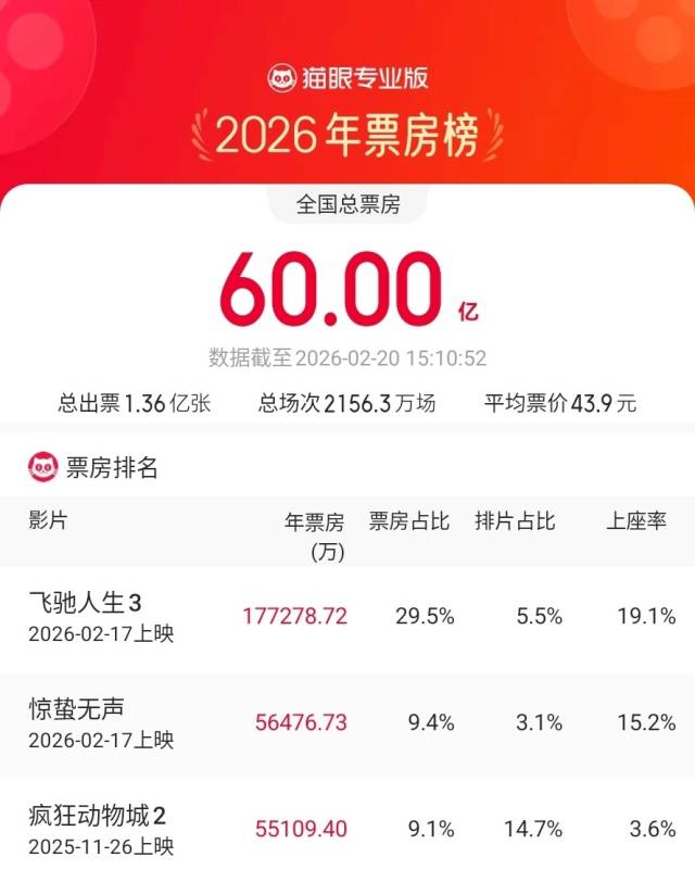 与此同时,在春节档的带动下,我国2026年度总票房已突破60亿元大关,《飞驰人生3》《惊蛰无声》《疯狂动物城2》暂列年度票房榜前三名。广东以超7亿元票房继续稳居全国“第一票仓”。