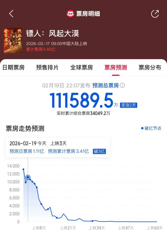 武侠动作片《镖人:风起大漠》以超4.5亿元的票房成绩暂居档期第四,但该片在2月19日实现了单日票房逆跌,也是春节档截至目前唯一一部单日排名实现上升的影片,目前跟前一名《熊出没·年年有熊》的差距正在缩小,很有可能凭借口碑长线实现逆袭。