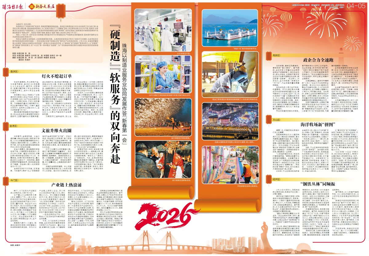 制造业与服务业深度融合,正是珠海破局的关键。从香洲区的研发设计到斗门区的PCB集群,从金湾区的文旅升维到高新区的软件赋能……各区实践正织就“珠海标识性”现代化产业体系的经纬。2月24日,全省高质量发展大会聚焦“制造业与服务业协同发展”,珠海正以区域协同作答:让“硬制造”因“软服务”更具竞争力,让“软服务”因“硬制造”更有支撑力,在“十五五”第一程中跑出“加速度”,为广东在推进中国式现代化建设中走在前列贡献珠海硬核力量。