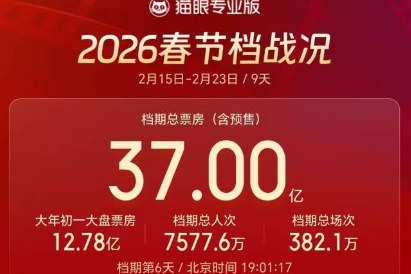 据猫眼专业版数据,截至2月24日零时,2026年春节档(2月15日至2月23日)总票房达57.49亿元,其中广东票房超5.88亿元,位居全国榜首。