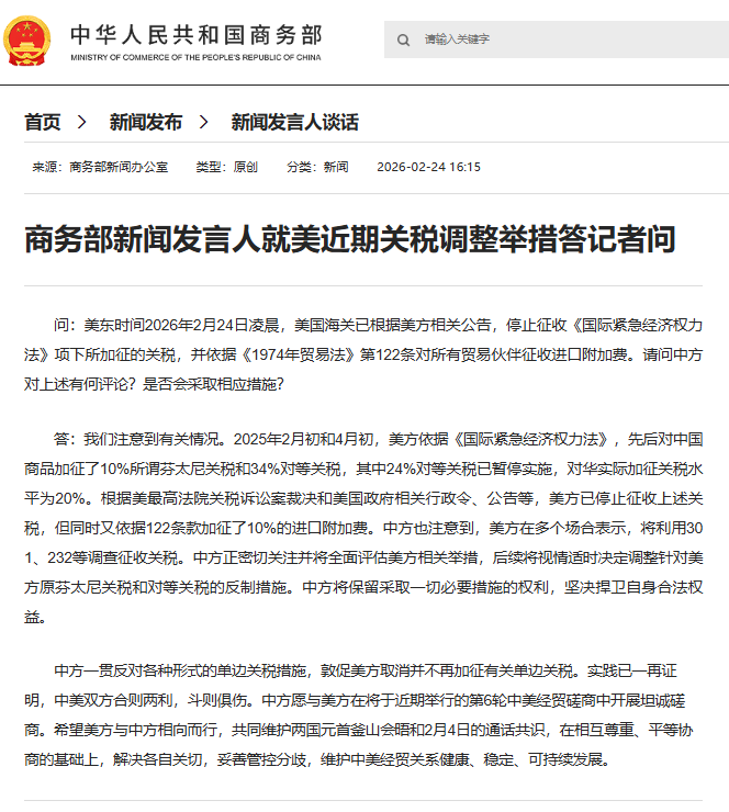 问:美东时间2026年2月24日凌晨,美国海关已根据美方相关公告,停止征收《国际紧急经济权力法》项下所加征的关税,并依据《1974年贸易法》第122条对所有贸易伙伴征收进口附加费。请问中方对上述有何评论?是否会采取相应措施?