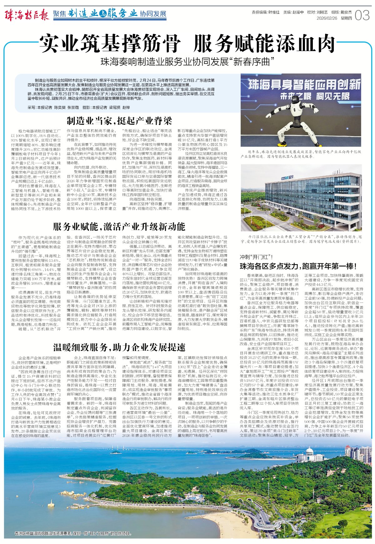 制造业当家,挺起的是产业脊梁;服务业赋能,激活的是升级动能。珠海用一个个落地的项目、一项项创新的举措、一次次暖心的服务,以只争朝夕的干劲,在制造业与服务业协同发展的道路上笃定前行,书写着高质量发展的“珠海答卷”。