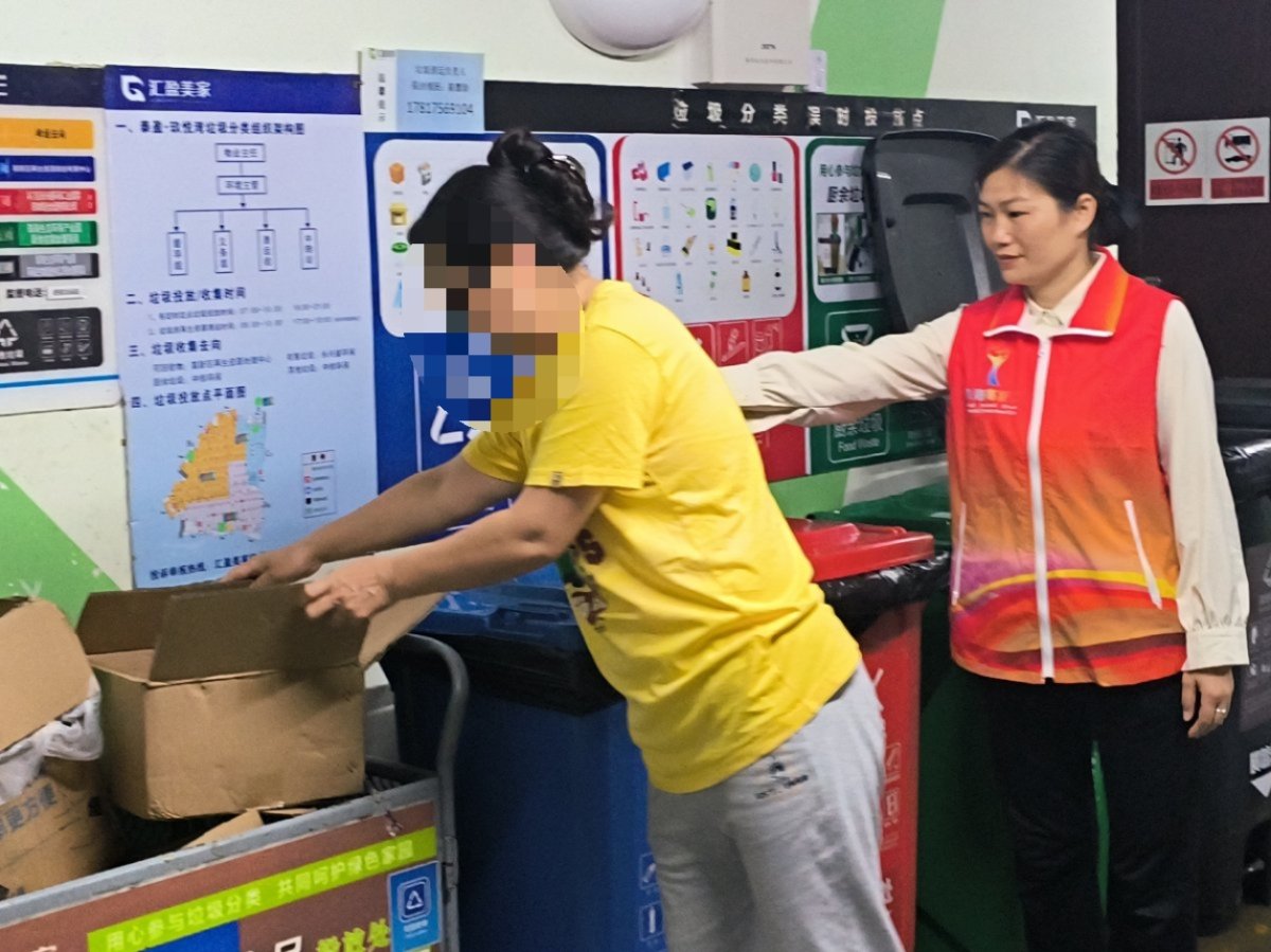 “您看,用过的纸巾属于其他垃圾,而这瓶子洗干净了才是可回收物。”小志愿者一边将错放的垃圾“完璧归赵”,一边耐心地当起了“小老师”。