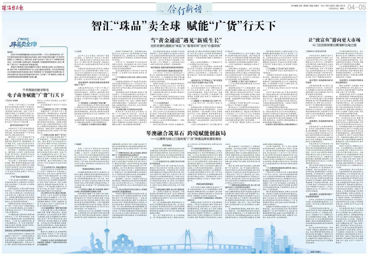 2026年全省高质量发展大会发出永争第一、不为人后的奋进号召,为广东在推进中国式现代化建设中走在前列、谱写“中国式现代化看广东”的时代新篇注入了强劲动力。乘此东风,本报今日启动“广货行天下”主题理论宣传活动。从文化叙事、品牌标准化、渠道拓展、非遗赋能等多维度深入探讨,聚焦“广货行天下 珠品卖全球”的珠海实践。
