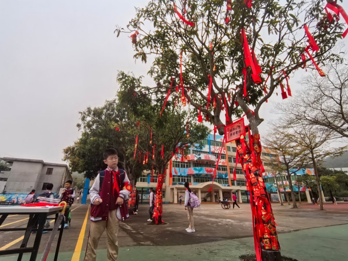 学校还设置了“心愿树”,学生们将写有新学期心愿或祝福语的红包,小心翼翼地粘贴在树干上。万千心愿汇聚成树,仿佛在春日里绽放新芽。此外,老师们将装有五谷杂粮的红包抛向心愿树,寓意五谷丰登、健康成长。