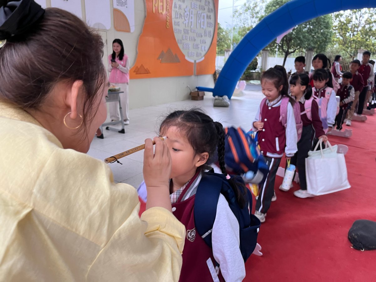 在“击鼓明志·朱砂启智”环节,孩子们手执木槌击鼓。鼓声咚咚,铿锵有力,传递着师生对新学期的美好祈愿。随后,校领导俯身用朱砂在学子额头轻点红痣,寄托“开启智慧,眼明心亮”的殷切期望。而在“拜新年·尊师礼”环节,全体学生向老师鞠躬,一声声“老师好”饱含着真挚的感恩之情。