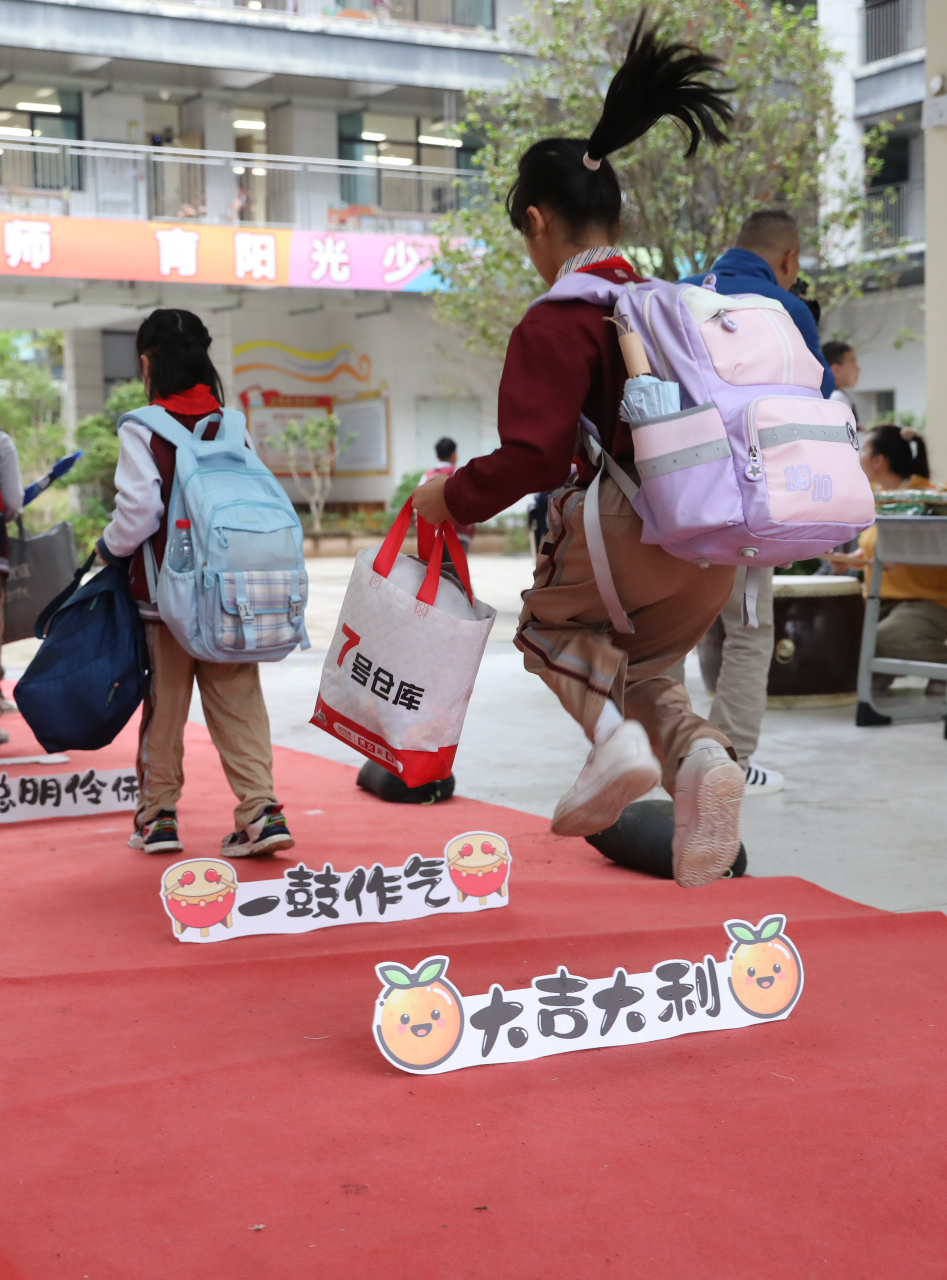 清晨7时许,景阳小学校领导守候在校门口迎接孩子们的到来。步入校园,一条鲜艳的红毯映入眼帘,这是学校特意设置的“趣味跨栏”区。红毯两侧,孩子们欢快地跨过一道道成长栏,象征跨过新岁、迎接新挑战。完成互动后,每个孩子还能领到一支棒棒糖,寓意新学期生活甜蜜、学习有滋有味。