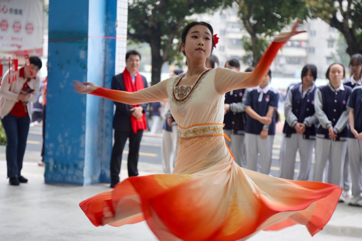 进入校园,体育馆一楼的架空层年味十足:新年拓印摊位上,几位同学正在忙着写挥春、拓福,校门口老师派送的福字就是出自他们之手;挂绳上,成排的灯谜卡片为即将到来的元宵佳节增添了喜庆氛围;作品展示区,同学们创作的春联、书画、剪纸等作品,寄托了他们对新学期的美好期盼。伴随着音乐的响起,初二年级的女生余乐橦翩然跳起哈萨克族的走马舞,吸引不少同学驻足围观。“今年是马年,我希望全校师生都能马到成功,向自己的梦想奔进。”她说道。