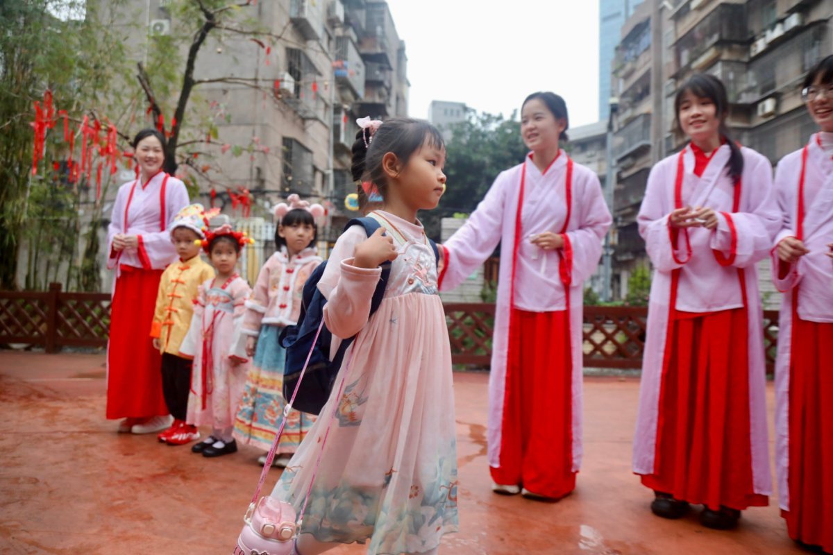 当天上午,一路之隔的桃园幼儿园也开展了主题为“萌娃迎春,骏马新程”的传统开学礼活动。孩子们在老师的带领下,身穿汉服,化身为小福马,跃马龙门、击鼓明志、拜孔子像……开启新学期的欢乐时光。