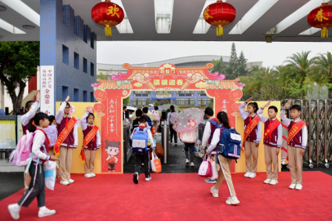早上7时许,记者在香洲区桃园路桃园中学校门口看到,身穿校服、满脸春风的学生陆续返校。护畅区,值班的行政老师站成一排,向同学们派送福字,祝愿大家福气满满、马到成功。