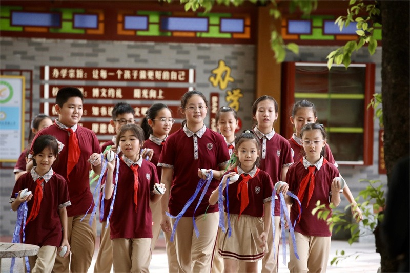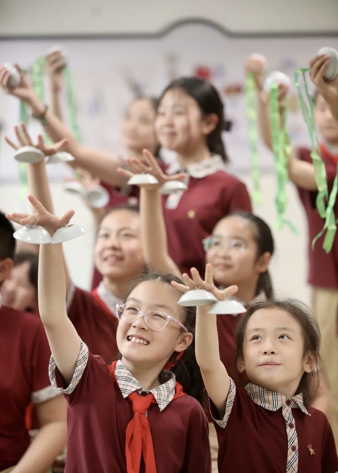 2021年起,翠微小学启动“非遗经典浸润童心”教学活动,杯沿相触的清脆声与童声合唱的粤语童谣《月光光》交织在一起:“月光光,照地堂;虾仔你乖乖瞓落床……”,让每一位孩子都能唱着童谣、敲着杯花翩翩起舞。