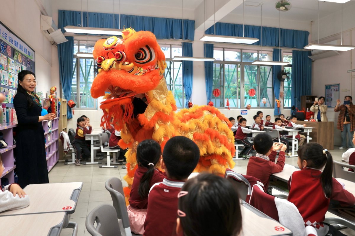 最让孩子们兴奋的是醒狮进教室环节。随着锣鼓声响起,醒狮在课桌间穿梭腾跃,时而眨眼卖萌,时而摇头摆尾,与孩子们亲密互动。不少孩子第一次近距离接触醒狮,兴奋地拍手叫好,教室里成了欢乐的海洋。
