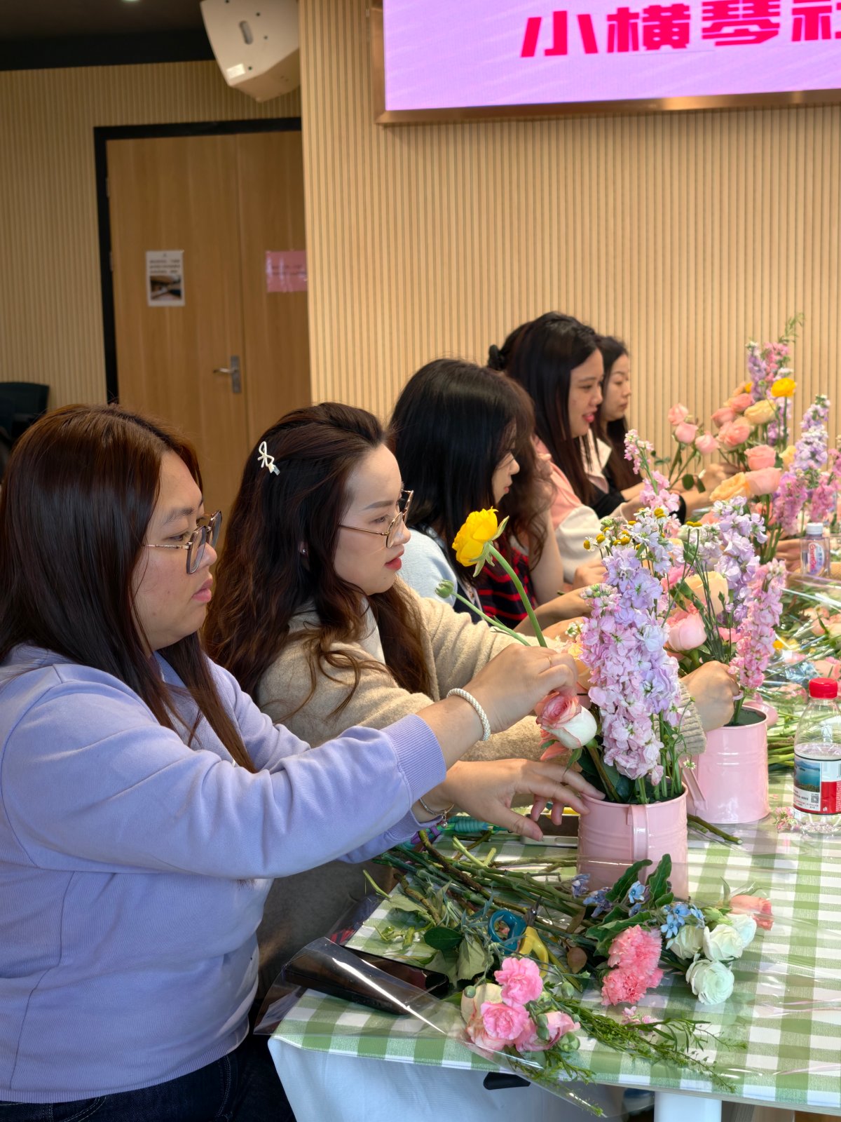 花艺体验环节中,参与者在专业导师指导下,以寓意“以爱浇灌生活”的小水壶为容器创作花艺作品,在修剪搭配的过程中舒缓工作与生活压力,相互交流切磋,现场花香四溢、笑语不断,活动最后大家手持花艺作品合影留念,定格节日美好瞬间。