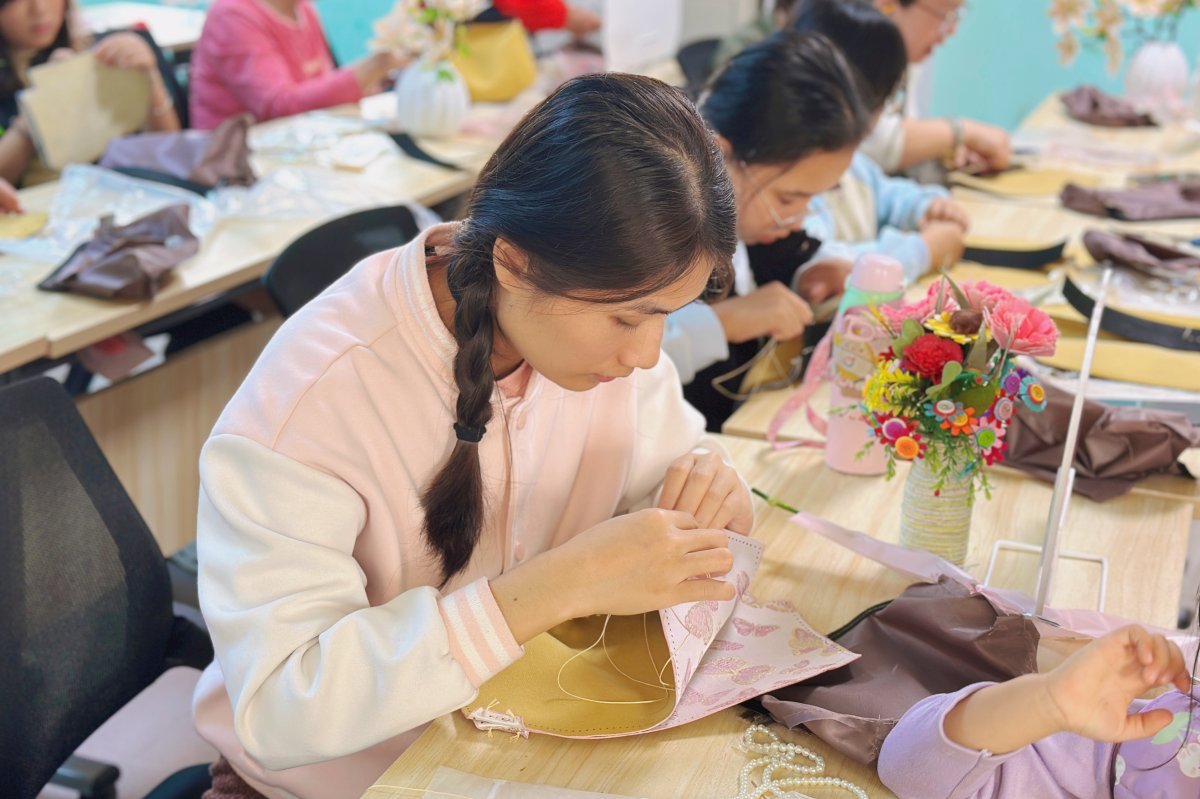 如果说学法是为女性披上维护权益的“铠甲”,那么手作便是为生活缝制温暖的“外衣”。在随后的口金包手作环节,妇女们纷纷拿起针线,在指导老师的悉心教学下,以针为笔、以线为墨,一针一线地缝制出独具特色的复古口金包。针线穿梭间,大家互相帮助、交流心得,分享生活智慧,现场流淌着温暖与欢笑。通过亲手制作,不仅体验了传统手工技艺的魅力,更在一针一线中传递着耐心、细致与专注的良好家风。