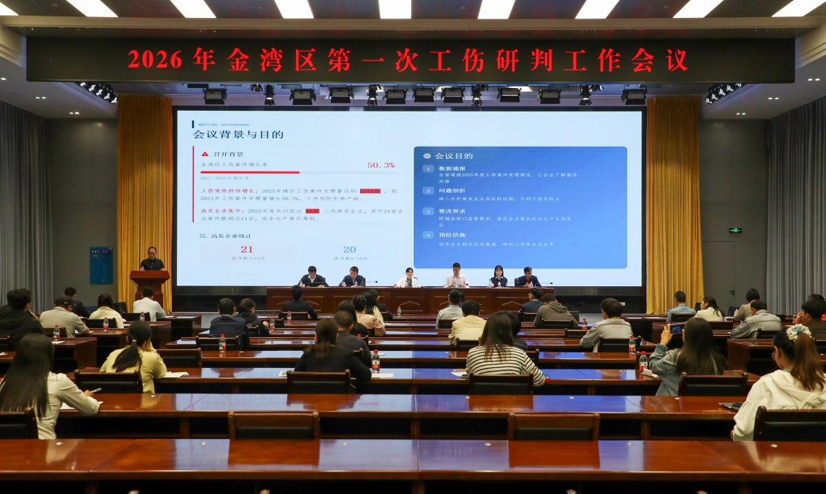 3月12日上午,金湾区人力资源和社会保障局在金湾区市民服务中心召开2026年第一次工伤研判工作会议,区内40家工伤高发企业的安全生产负责人参加会议,共同剖析问题根源,共商治理对策,将安全关口前移,全力打好新一年工伤预防主动仗。