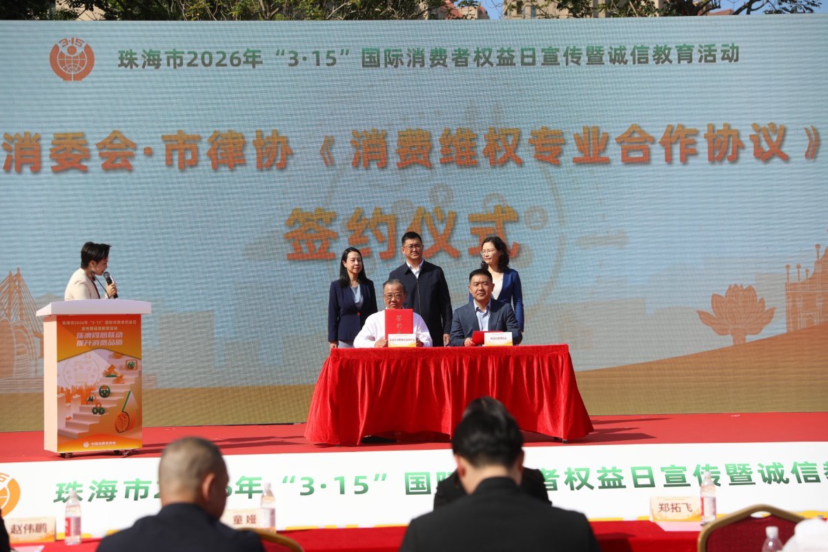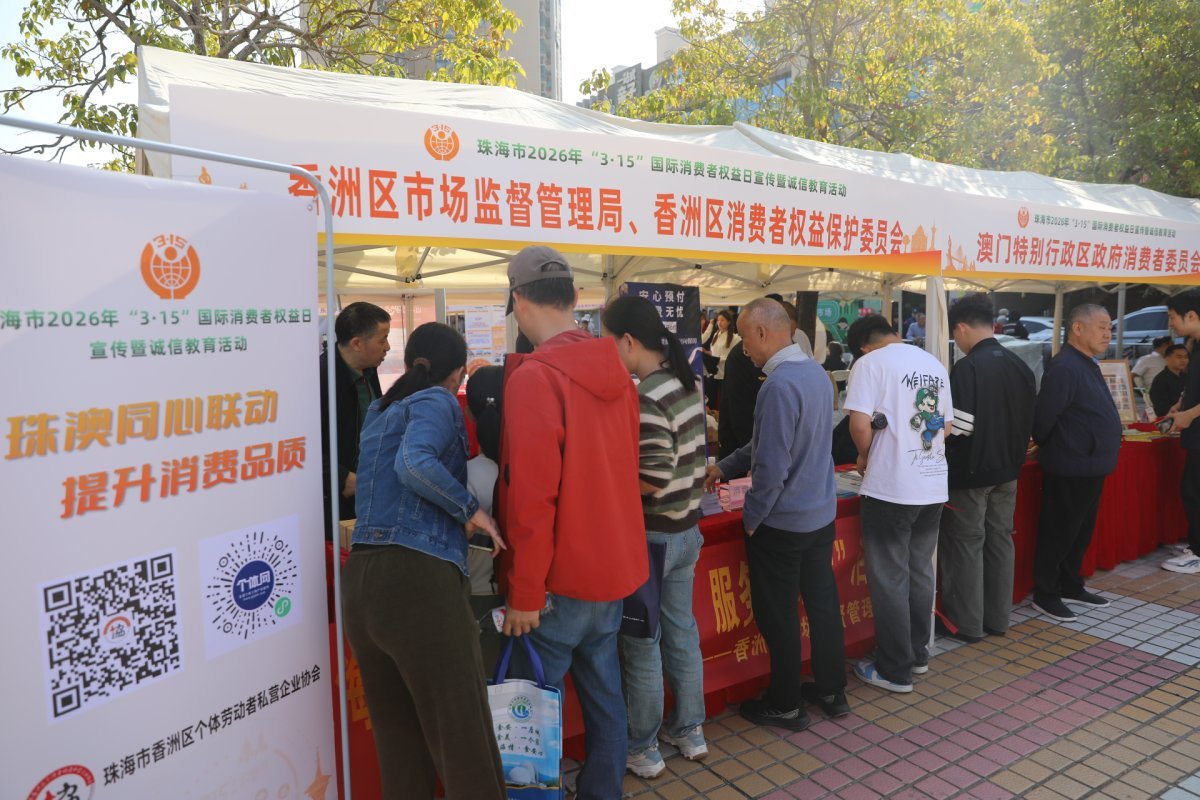 3月15日,全市19个会场同步举办2026年“3·15”国际消费者权益日现场宣传暨诚信教育活动,星园市场前广场作为主会场,珠海市市场监督管理局、珠海市消费者权益保护委员会与澳门特别行政区政府消费者委员会在此联合开展活动。当天,市消委会与市律师协会签署合作协议,放心消费“双承诺”经营者代表郑重向全社会宣誓,相关机构还开展了检测鉴定服务。