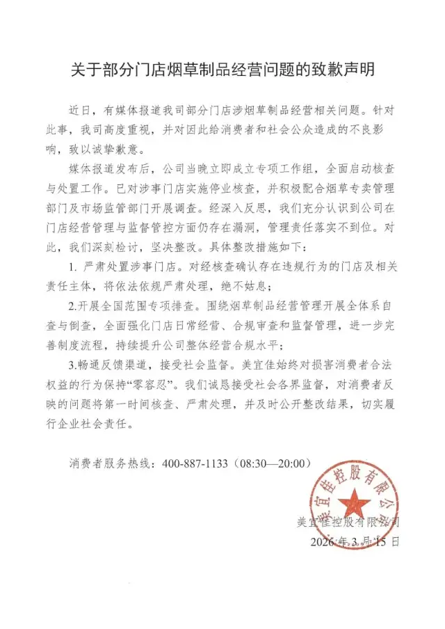 近日,有媒体报道我司部分门店涉烟草制品经营相关问题。针对此事,我司高度重视,并对因此给消费者和社会公众造成的不良影响,致以诚挚歉意。媒体报道发布后,公司当晚立即成立专项工作组,全面启动核查与处置工作。已对涉事门店实施停业核查,并积极配合烟草专卖管理部门及市场监管部门开展调查。经深入反思,我们充分认识到公司在门店经营管理与监督管控方面仍存在漏洞,管理责任落实不到位。对此,我们深刻检讨,坚决整改。具体整改措施如下:1.严肃处置涉事门店。对经核查确认存在违规行为的门店及相关责任主体,将依法依规严肃处理,绝不姑息;
