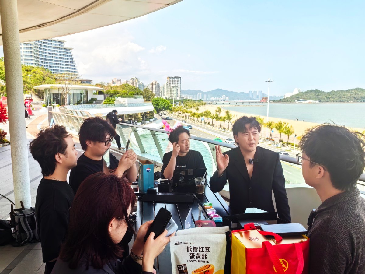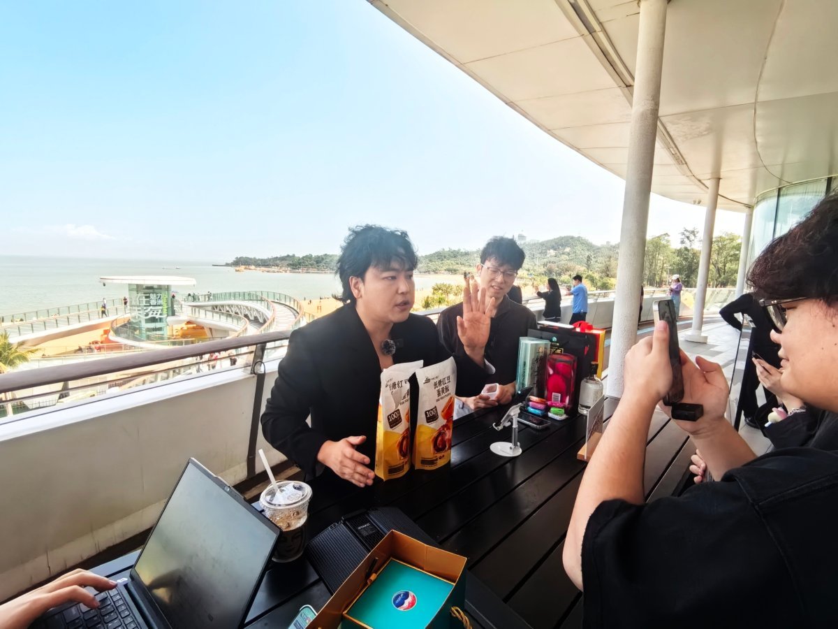 城市阳台依海而建,海风轻拂、视野开阔,直播现场以简约的布景搭配珠海城市景观,形成独具特色的户外直播场景。