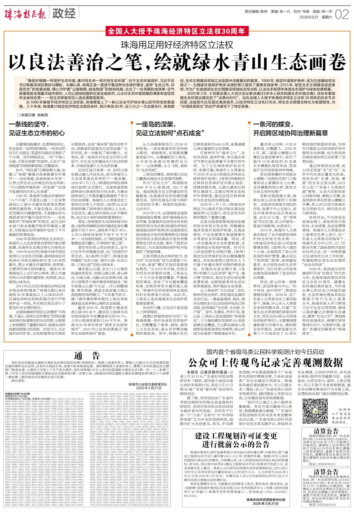 2026年,是我国生态环境保护开启“法典化”时代的元年,也是珠海获得经济特区立法权30周年。随着生态环境法典的诞生,守护绿水青山的法治之网越织越密,生态环境治理体系和治理能力现代化迈上更高水平,珠海将深入学习贯彻习近平生态文明思想,继续以高质量立法赋能生态建设,擦亮“百岛之市”、情侣路特色滨海湾区、淇澳红树林等城市名片,为美丽中国、绿美广东建设贡献更多“珠海样本”。