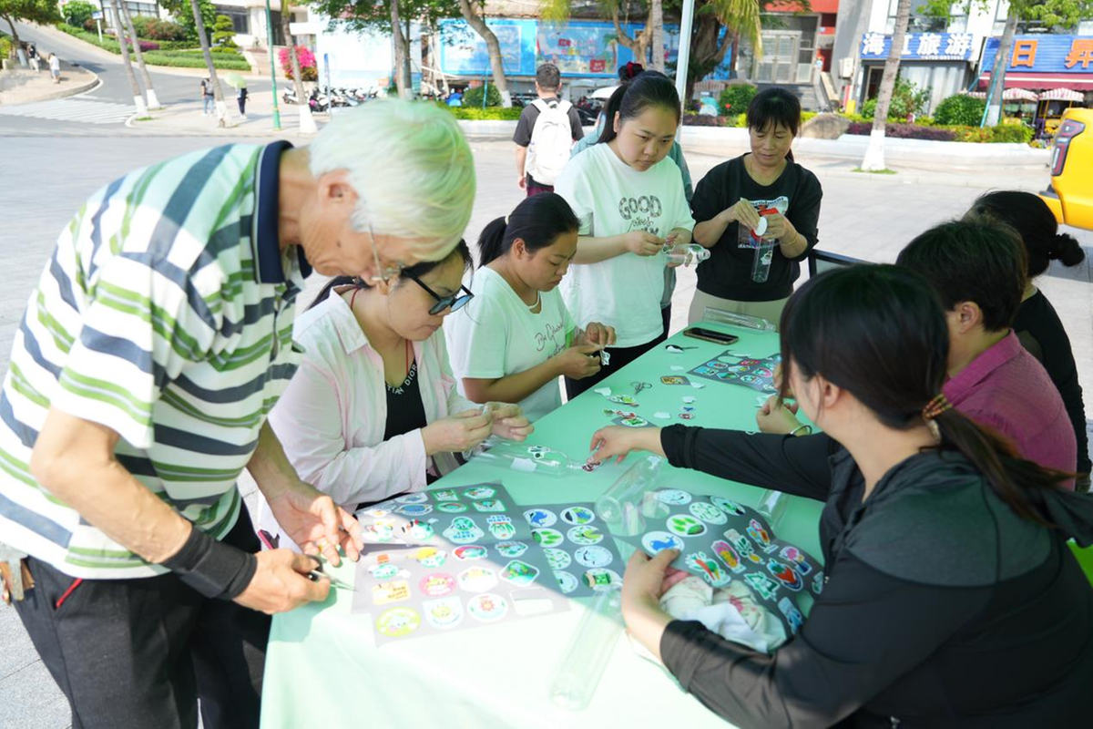 在旁边的手工DIY活动区,大家正在忙着“变废为宝”。在工作人员的引导下,心灵手巧的居民们用废旧塑料瓶、卡纸等可回收材料制作精美笔筒,通过一番剪裁、拼接、彩绘,原本只能进垃圾桶的废品,摇身一变成为书桌上独具特色的实用文具。