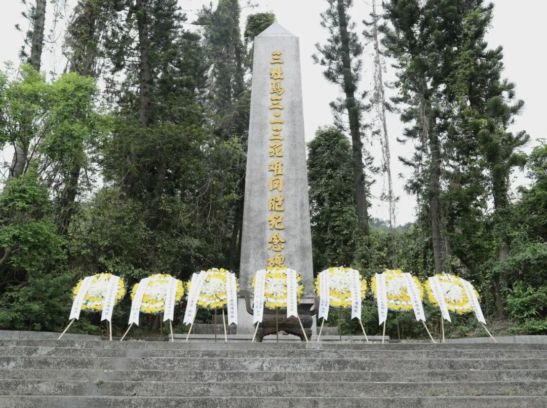 苍松翠柏掩映下的纪念碑巍然耸立。全体人员肃立默哀,深切缅怀三灶岛“三一三”死难同胞。随后少先队员代表献唱《我们是共产主义接班人》,用嘹亮的歌声传递出新时代少年传承英烈精神、勇担使命的坚定信念。