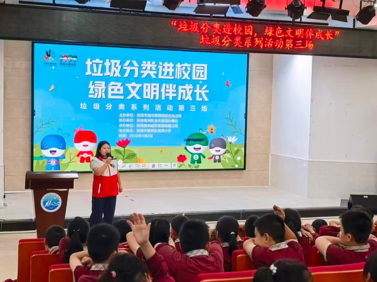4月2日下午,珠海市城市管理和综合执法局主办、香洲区吉大街道办事处协办、高华城市资源有限公司承办的“垃圾分类进校园,绿色文明伴成长”系列活动第三场,在香洲区海湾小学开展,全校250余名学生参与本次培训,沉浸式学习垃圾分类知识,践行绿色环保理念。